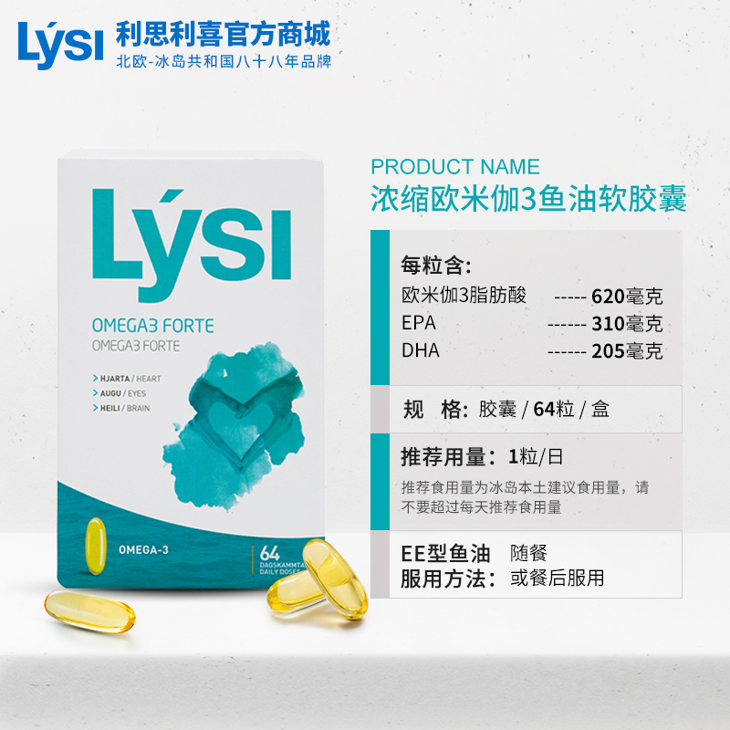 Lysi利思利喜冰岛进口天然浓缩欧米伽3深海鱼油成人中老年高含量DHA 64粒*2盒